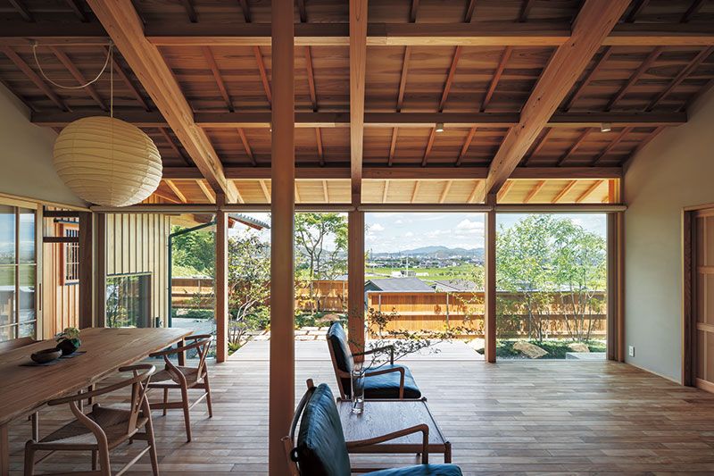 岡山市の丘陵地に佇む自然素材の平屋住宅。大工修業を経て棟梁として独立した建築家・安藤洋介が、自ら設計・施工・作庭までを手がけた一邸です。伝統工法「折置組」による小屋組みが美しい室内は、吉野杉の上小節材を用いた手刻みによって生まれた上質な空間。軒深く光と風を招く開口部と、田園や斜面の緑を望む開放的な居間が、豊かな自然とつながります。庭は季節の樹木や苔、石を配した丁寧な作庭。暮らしの中に自然が息づく、職人の手仕事が光る注文住宅です。