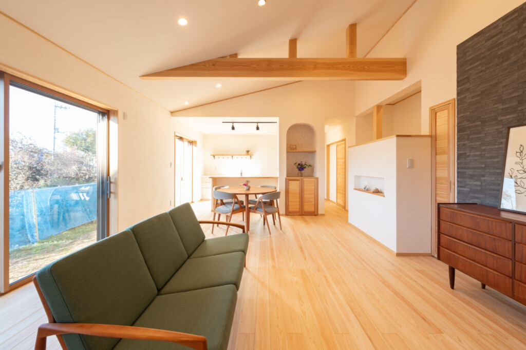 窓からたっぷりと自然光が差し込み、平屋ならではの勾配天井が開放感を演出するリビング。家族が自然と集まり、のびのびと心地よく過ごせる空間です。